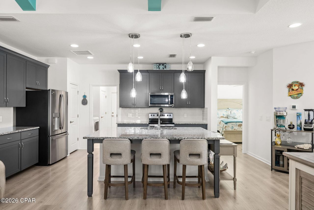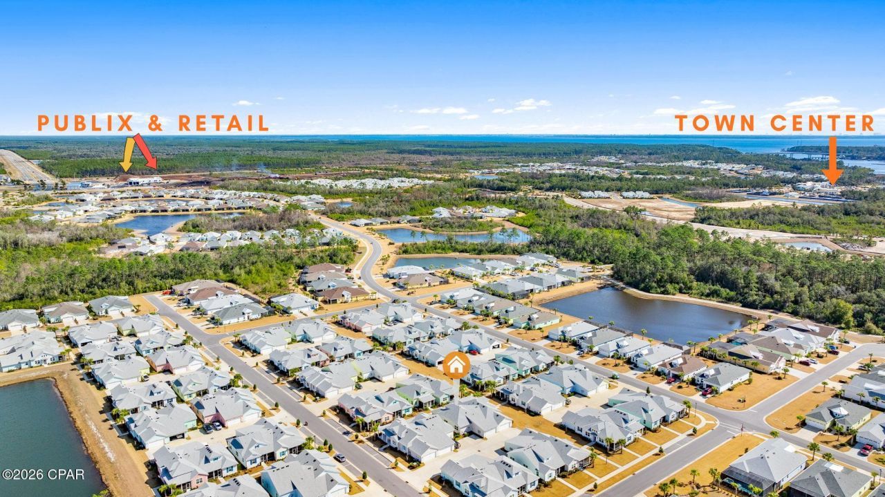 Fins Up! Dive into the ''no worries'' lifestyle with this stunning Camellia cottage in the highly sought-after Phase 4A of Latitude Margaritaville Watersound. Walking distance to the town center, dog park and the retail; this home is packed with upgrades, making it the perfect retreat for those ready to live on ''island time. '' Home Highlights: Chef's Island Kitchen: Features an extended kitchen island with Level 1 Luna Pearl granite , custom Level 3 white tile backsplash , and sleek 42'' Grey Hound cabinetry with crown molding. Upgraded Living Spaces: Bright and airy with LED recessed lighting throughout the main living areas and a convenient pocket door added to the Master Bath for a streamlined flow. Enjoy the perfect blend of style and function with a built-in TV focal wall, finished with decorative fluted columns and a custom mantel-style header. The neutral tones perfectly complement the vibrant coastal teal ceiling beams and driftwood-inspired flooring. Stylish Master Suite: Relax in a master bath featuring Level 3 Calacatta Empire floor tile and elegant granite countertops. Thoughtful Additions: Laundry Room: Custom cabinets added to the ceiling for maximum storage and GE Profile Washer and Dryer. Garage: Professional epoxy flooring for a clean, durable finish, plus a utility sink and full insulation package plus garage door insulation! From the whole-house gutters to the stainless steel preferred appliance package, every detail has been handled. Just bring your flip-flops and start living the dream! INCLUDED with the purchase of this home is the refrigerator in the kitchen (4 year remaining warranty), the refrigerator in the garage, the washer & dryer, the commercial ice maker in the garage, the ice chest in the garage and the great room TV with Bose Sound Bar. All other furnishings are for sale. See the documents section for items not for sale and full list of upgrades!